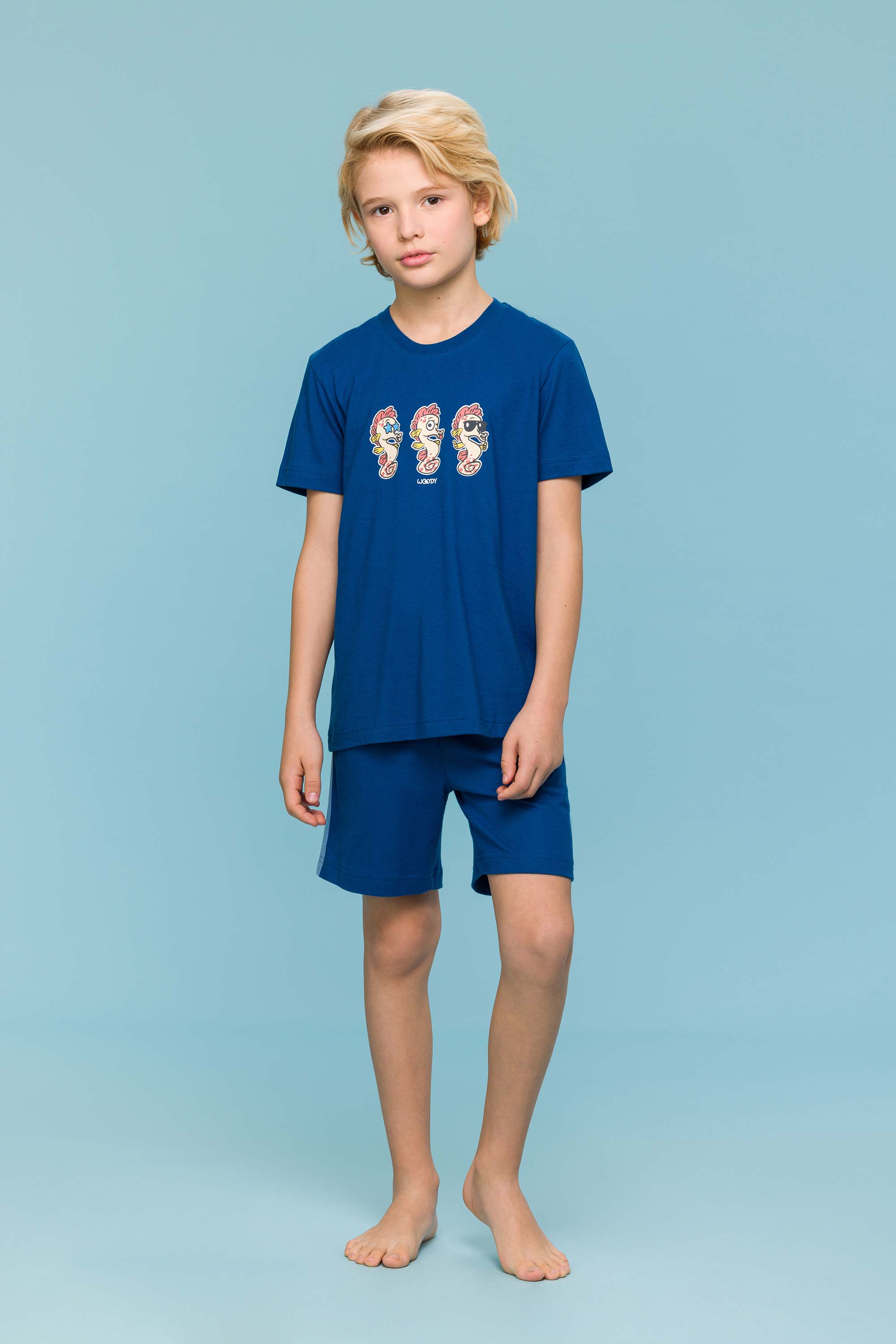 Jongens shorty pyjama van soepel effen donkerblauw katoen. Het T-shirt blinkt uit door de prachtige print van de 3 emoji's van onze Woody zeepaardjes. De short heeft een modieuze contrastbies opzij. Voor zomernachten in een trendypyjama.